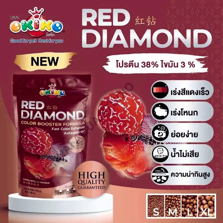 Enhance the beauty of your Flowerhorn with Okiko Red Diamond Flowerhorn Fish Food, specially formulated to boost vibrant red coloration and accentuate the red head mark (Kok). Enriched with astaxanthin, a powerful natural color enhancer, this premium fish food promotes fast color development, healthy growth, and overall vitality.